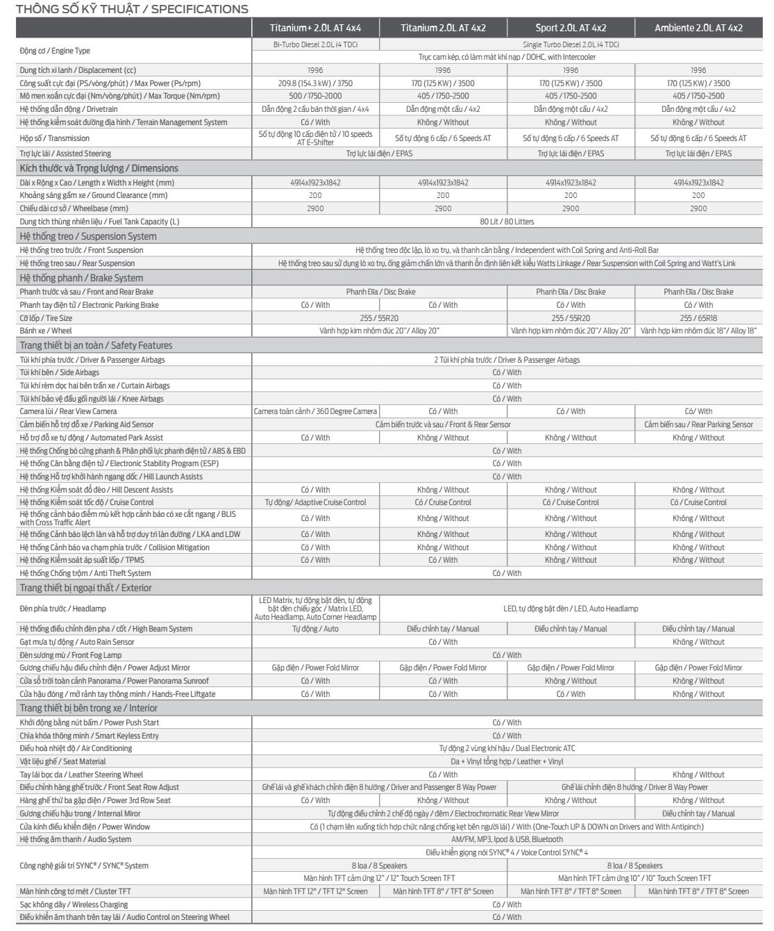 Ở thế hệ thứ 4, Ford Everest được trang bị 2 tùy chọn động cơ, gồm: